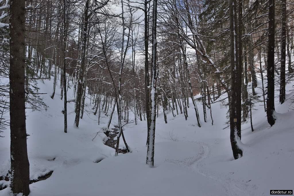 A urmat apoi ultima porțiune de coborâre pe drumul forestier, cu ghețuș zdravăn pe alocuri. Hai, doar nu facem vreo figură chiar acum. Ne-a prins și seara din urmă, însă am întâmpinat-o cu niște lanterne frontale. Într-un final, pe la 19, am ajuns înapoi la mașină. Slavă Domnului că am ajuns cu bine! 🙂