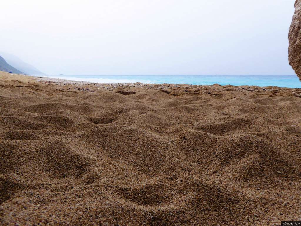 Peisajul plajei, deși nu este stâncos/impunător așa cum ne obișnuiește Lefkada, este unul dintre cele mai frumoase văzute de noi prin Grecia. După un prim contact vizual foarte fain, dai de un alt răsfăț, de data aceasta sub tălpile picioarelor. Plaja, lungă de câțiva km, prezintă nisip extrem de fin, din belșug! Culoarea apei Mării Ionice este incredibilă, un albastru-turcoaz de vis!!!, așa cum te aștepți să admiri după ce vezi imaginile pe Google.